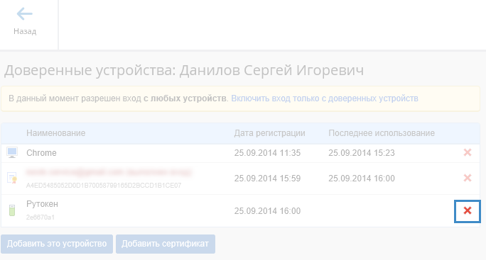 Откроется страница со списком доверенных устройств пользователя (рис. 17). Щелкните мышью по пиктограмме