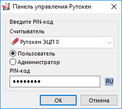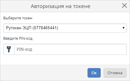 При нажатии на данную кнопку открывается окно авторизации на токене, где необходимо выбрать Рутокен, ввести PIN-код токена и нажать на кнопку ОК (Рис. 12).