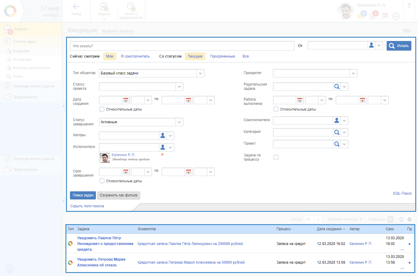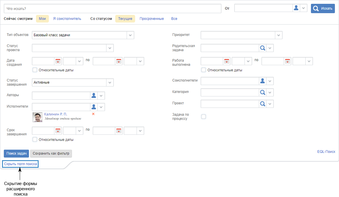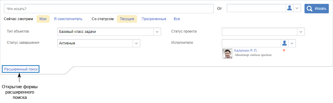 Набор параметров расширенного поиска при поиске различных объектов индивидуален. Также существует возможность создания новых параметров поиска и добавления их на форму расширенного поиска.