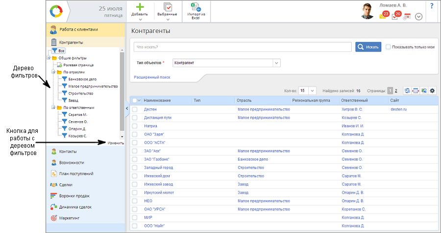 В каждом разделе модуля Работа с клиентами на панели слева находится дерево фильтров (рис. 1), где отображены фильтры, созданные в рамках текущего раздела. Для того, чтобы применить фильтр к объектам, необходимо щелкнуть мышью по названию фильтра. На странице с объектами отобразятся соответствующие результаты поиска.