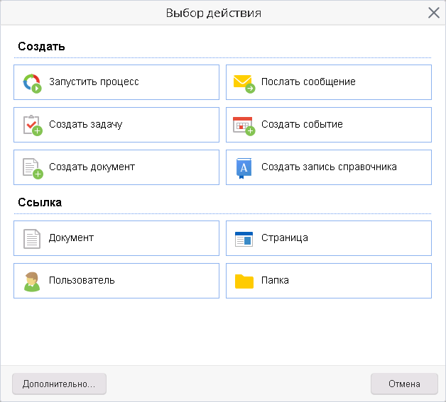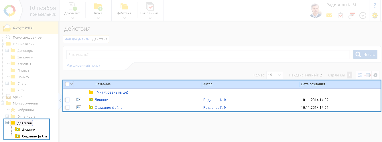 Созданная папка-действие обеспечивает быстрый доступ пользователя к часто выполняемым действиям. Подробнее о действиях в системе ELMA см. соответствующий раздел справки.