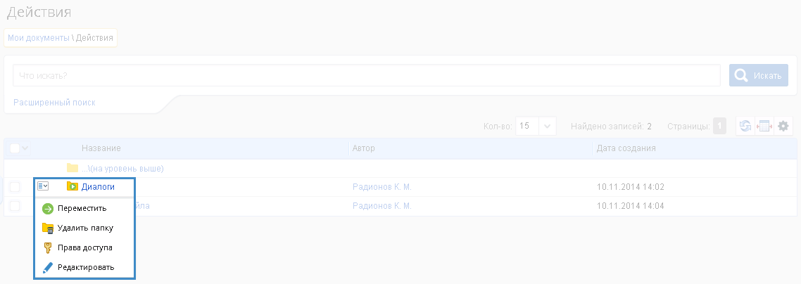 Папка-действие (рис. 1) обозначается значком в дереве папок и на странице родительской папки. Папка-действие может быть создана в любой папке раздела Документы при наличии соответствующих прав доступа.
