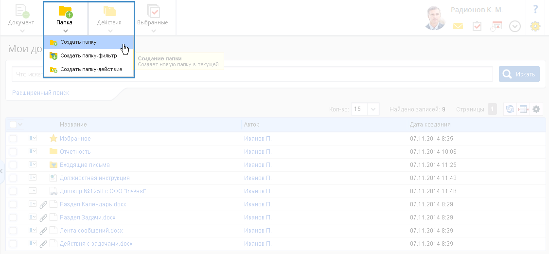 Для создания папки текущий пользователь должен иметь уровень прав "Редактирование" и выше на родительскую папку. Для создания папки необходимо открыть папку, в которой требуется создать вложенную папку, и в верхнем меню данной папки нажать на кнопку Папка или Папка – Создать папку (рис. 1).