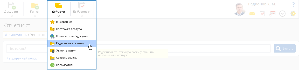 Для редактирования папки необходимо открыть требуемую папку и в верхнем меню данной папки нажать на кнопку Действия – Редактировать папку (рис. 3). По умолчанию данная кнопка доступна автору, администратору системы ELMA и другим пользователям с уровнем прав "Редактирование" и выше.