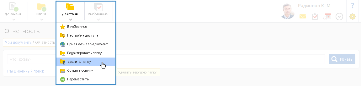 Для удаления папки необходимо открыть требуемую папку и в верхнем меню данной папки нажать на кнопку Действия – Удалить папку (рис. 4). По умолчанию данная кнопка доступна автору, администратору системы ELMA и другим пользователям с уровнем прав "Редактирование" и выше.
