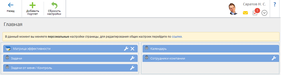 на общем– настройки будут видны всем пользователям. Данную настройку могут производить только пользователи, обладающие соответствующим уровнем прав. Права для данной настройки назначаются в разделе Администрирование – Доступ приложений – Глобальные настройки доступа – Портал – Разрешить настройку персонального набора главных страниц. Отображение данной страницы у всех пользователей системы зависит от установленных настроек.