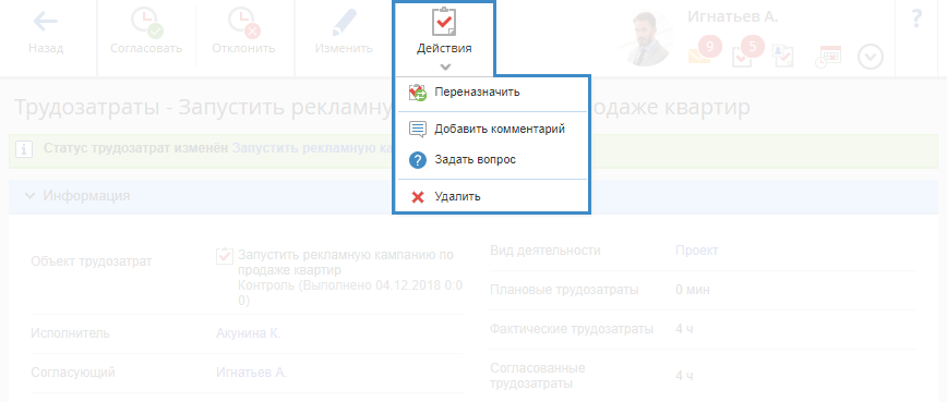 При нажатии на кнопку Действия или на пиктограмму появляется выпадающее меню, которое предлагает выбрать различные действия с трудозатратой в зависимости от роли пользователя.
