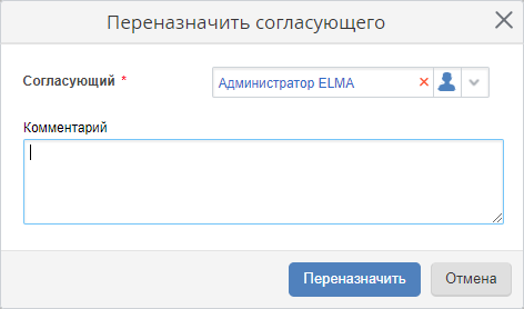 Переназначение согласующего пользователя доступно для трудозатраты, имеющей статус "На согласовании". Переназначение согласующего пользователя доступно автору и руководителям автора (согласно оргструктуре предприятия), а также текущему согласующему и администратору системы ELMA.