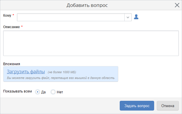 При необходимости к трудозатрате может быть добавлен вопрос. Для добавления вопроса к трудозатрате необходимо на странице трудозатраты в верхнем меню нажать кнопкой мыши на кнопку Действия – Задать вопрос и в открывшемся диалоговом окне в поле Кому *выбрать пользователя, которому будет задан вопрос, а также ввести текст вопроса в поле Описание *(рис. 3). Данные поля являются обязательными для заполнения.