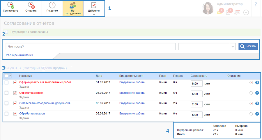 1. В разделе Трудозатраты – Согласование установить флажки на необходимые трудозатраты в таблице трудозатрат.