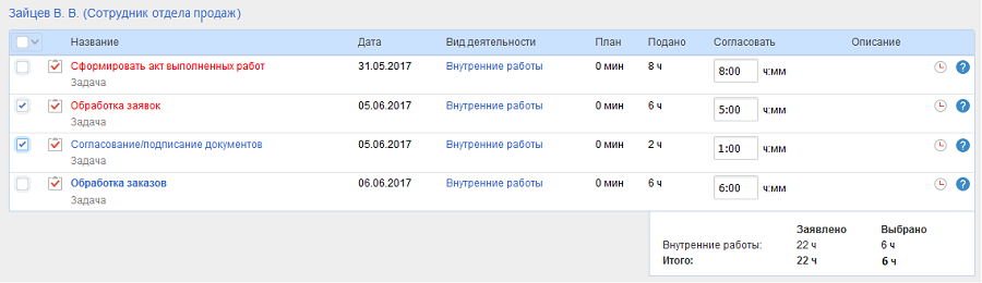 2. При необходимости в столбце Согласовано можно изменить количество часов, поданное на согласование пользователем. При этом в сводной таблице в зависимости от видов деятельности отображаются заявленные исполнителем и выбранные для согласования часы.