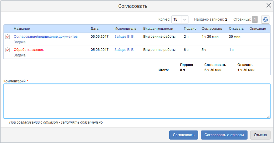 Для частичного согласования трудозатрат (с отказом по части поданных часов) необходимо нажать на кнопку Согласовать с отказом в нижней части окна (рис. 5). Поле Комментарий в данном случае является обязательным для заполнения.