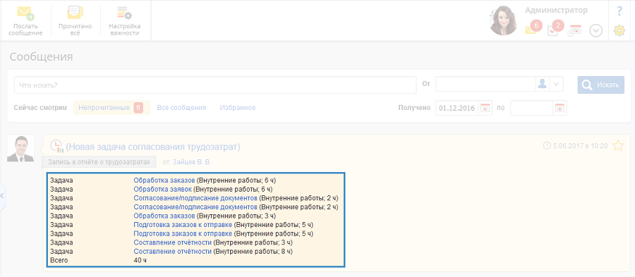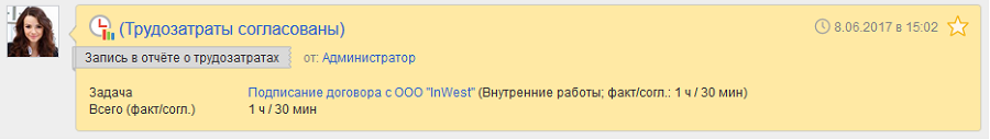 Рис. 2. Лента сообщений. Уведомление о согласовании трудозатрат