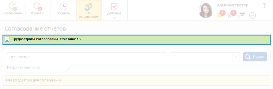 В данном случае после согласования трудозатрат на странице появится уведомление о согласовании с указанием отказанных в согласовании трудозатрат (рис. 7).