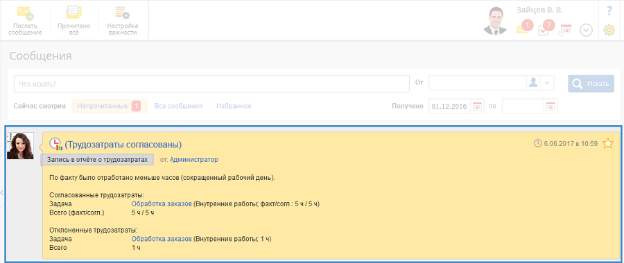 Рис. 6. Лента сообщений. Уведомление о результатах согласования трудозатрат