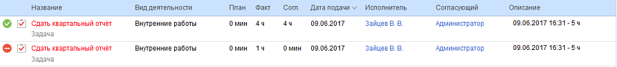 Также следует отметить, что при выборе данного варианта согласования трудозатраты в согласованном отчете будут разделены на 2 записи: запись о согласовании трудозатрат и запись об отклонении трудозатрат (рис. 9). Например, пользователем по задаче было отправлено на согласование 5 часов. В связи с тем, что рабочий день был укороченным, было согласованно только 4 часа. При этом в отчете о трудозатратах отдельными записями будет зафиксировано 4 согласованных часа и 1 отклоненный.