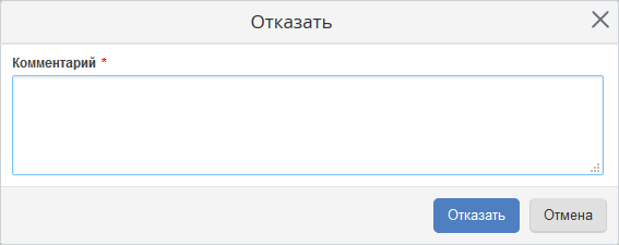 2. В верхнем меню текущей страницы нажать кнопкой мыши на кнопку Отказать. При этом будет отображено окно (рис. 10), в котором требуется ввести комментарий к отклоняемым трудозатратам, и нажать на кнопку Отказать.