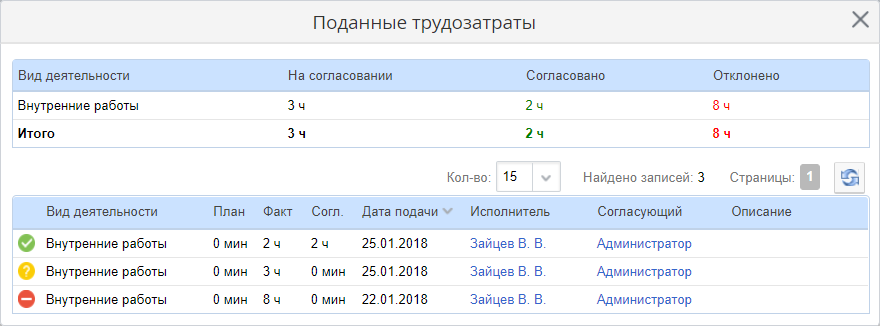 . При нажатии на данную кнопку будет отображено окно, содержащее сводную таблицу трудозатрат по текущей деятельности и таблицу с полным списком трудозатрат (согласованных, отклоненных и находящихся на согласовании), поданным по данной деятельности (рис. 3).