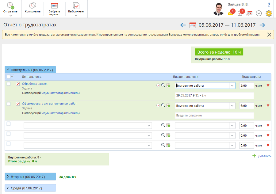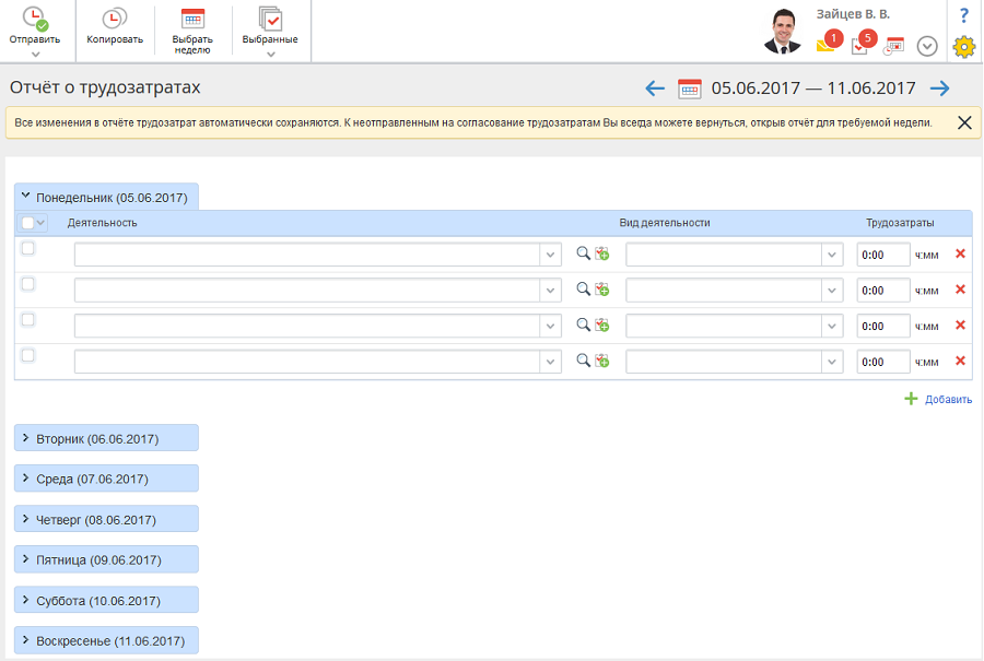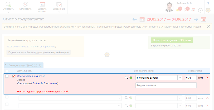 Следует отметить, что все изменения в отчете трудозатрат автоматически сохраняются. К неучтенным трудозатратам пользователь может вернуться в любое время, открыв отчет требуемой недели.