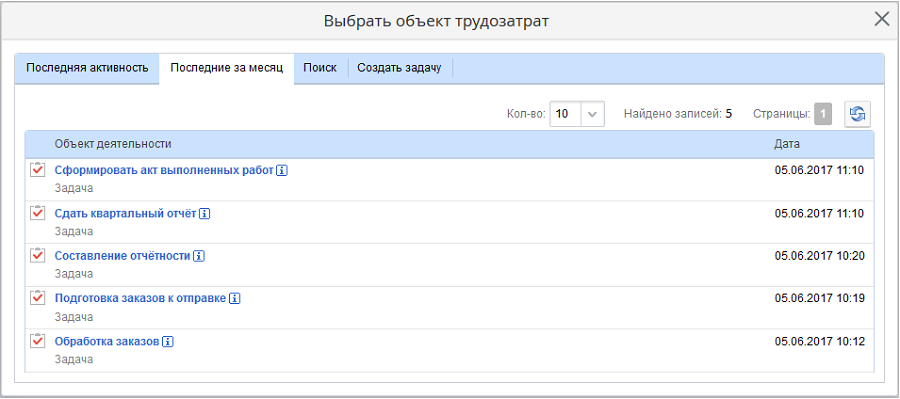 Рис. 5. Окно выбора объектов трудозатрат. Вкладка "Последние за месяц"