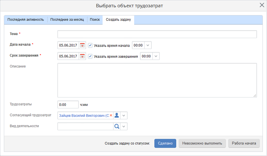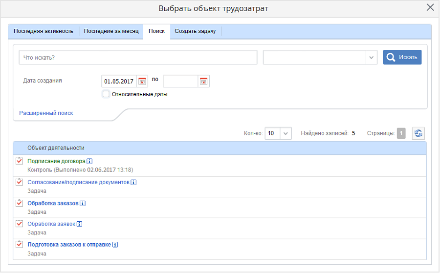 Для отметки доступны трудозатраты по определенным активностям, например, события календаря, контрагенты, встречи и т.д. Подробнее об объектах трудозатрат см. соответствующий раздел справки.