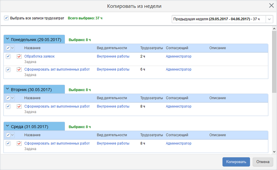 Стоит отметить, что объекты трудозатрат копируются только в те дни недели, из которых были скопированы. Например, если копируются трудозатраты за понедельник и среду прошлой недели, то в текущей неделе они также будут добавлены на понедельник и среду. Для копирования доступны любые объекты трудозатрат, кроме удаленных и отклоненных.