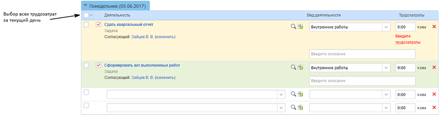 оранжевым цветом подсвечиваются трудозатраты, заполненные не полностью (рис. 3);