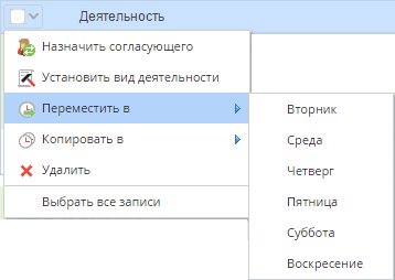 Перенести скопированные трудозатраты в другой день текущей недели можно с помощью кнопки Переместить в.