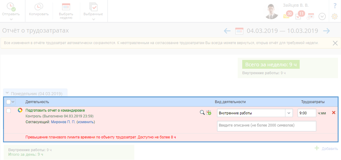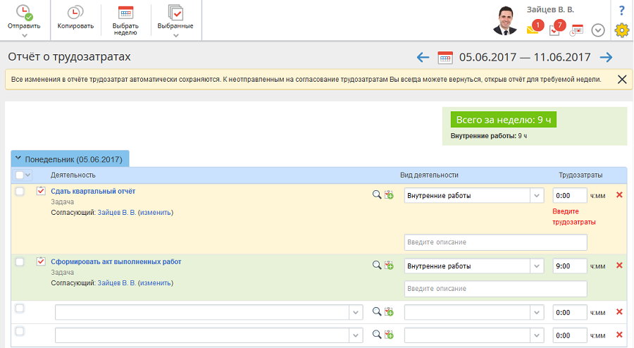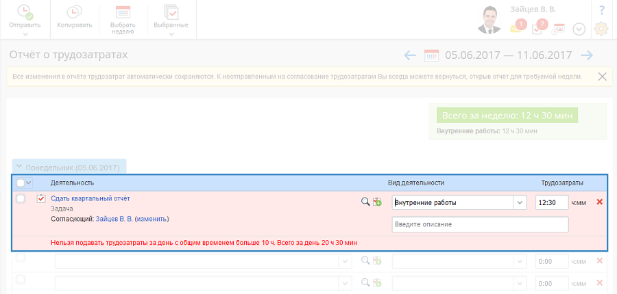 Следует отметить, что если некоторые трудозатраты не были автоматически отправлены на согласование из-за каких-либо