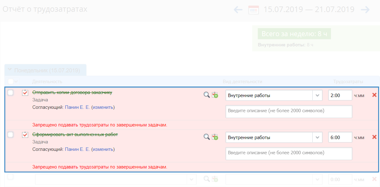 Запрещено подавать трудозатраты по завершенным задачам. Трудозатрата будет подсвечена красным цветом (рис. 15).