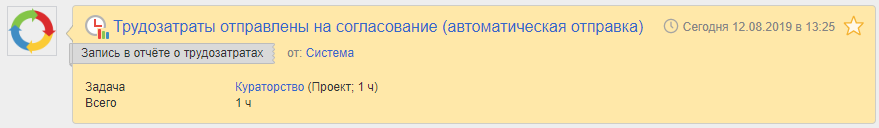 Рис. 16. Лента сообщений. Уведомление об автоматической отправке трудозатрат на согласование