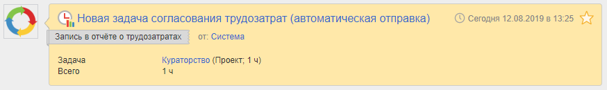 Рис. 17. Лента сообщений. Уведомление о новой задаче согласования трудозатрат (автоматическая отправка)