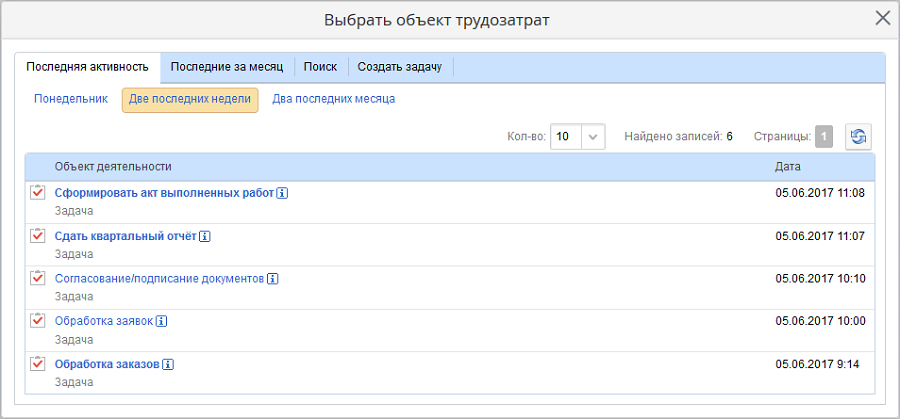 Рис. 4. Окно выбора объектов трудозатрат. Вкладка "Последняя активность – Две последних недели"
