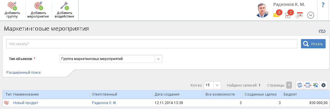 Рис. 1. Страница отображения группы маркетинговых мероприятий