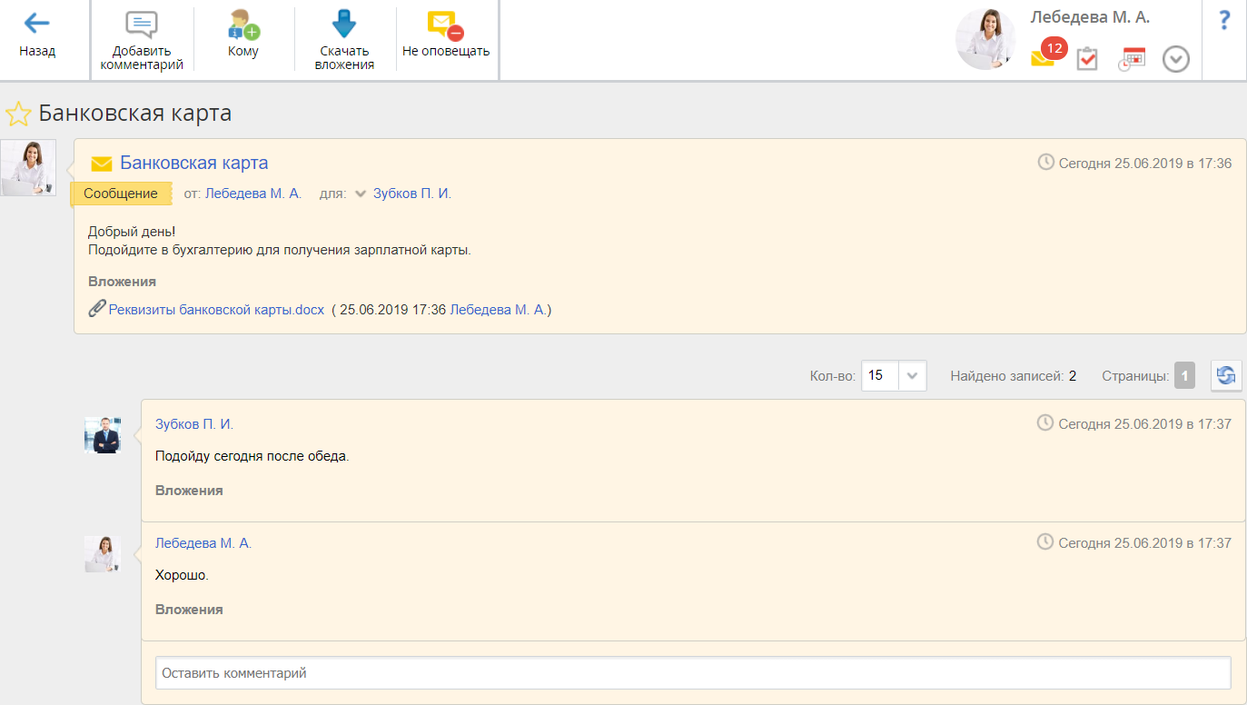 При добавлении пользователя в середине диалога он получит оповещение о том, что его добавили к получателям текущего сообщения. При переходе на страницу сообщения пользователь увидит все комментарии, оставленные другими пользователями до его добавления к обсуждению. Данная кнопка отображается только на странице автора сообщения.