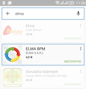 Для установки мобильного приложения ELMA BPM на мобильное устройство с платформой Android необходимо осуществить поиск по параметру ELMA в Play Маркете Google (рис. 1), а для установки на мобильное устройство с платформой iOS необходимо осуществить поиск по параметру ELMA в AppStore (рис. 2).