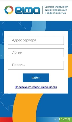 Стартовое окно приложения изображено на рис. 10, 11. Для осуществления авторизации в системе необходимо заполнить требуемые поля (ввести учетные данные пользователя ELMA для входа в систему) и нажать на кнопку Войти. Авторизация в системе возможна только при подключении к сети Интернет. Осуществить выход из системы можно в офлайн-режиме работы приложения. Также в данном окне можно ознакомиться с информацией о политике сбора, использования и передачи персональной информации пользователей приложения ELMA BPM, для этого следует нажать на ссылку