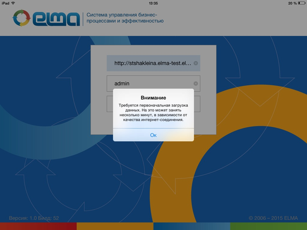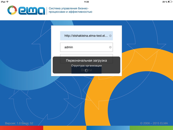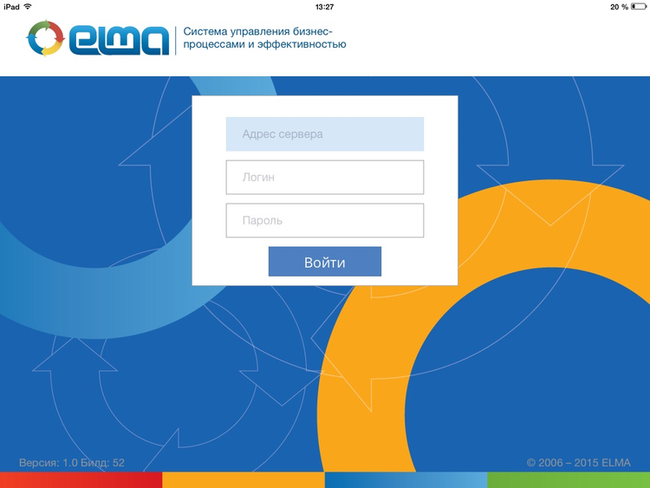 Рис. 11. Платформа iOS. Стартовое окно приложения "ELMA BPM HD"