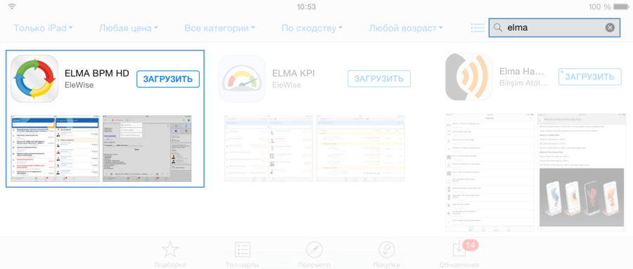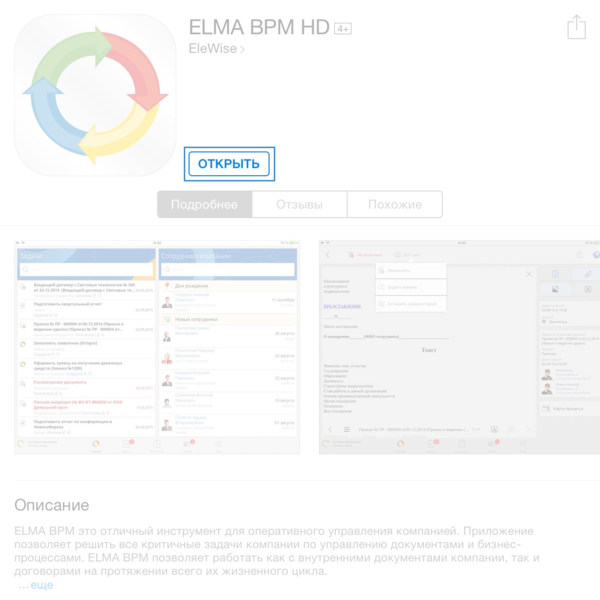 Установка мобильных приложений ELMA BPM и ELMA KPI аналогичны. В данном примере рассмотрена установка приложения ELMA BPM. Следует отметить, что в AppStore данное мобильное приложение называется ELMA BPM HD.