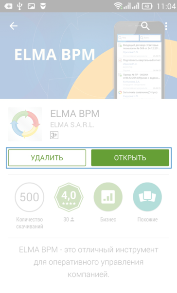 Рис. 6. Страница приложения "ELMA BPM" в Play Маркете Google. Кнопки "Удалить" и "Открыть"