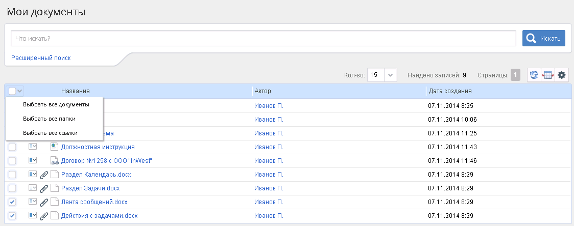 В хранилище документов одновременно может быть выбрано несколько документов, папок или ссылок (рис. 1) путем установки флажков, расположенных слева от объекта.
