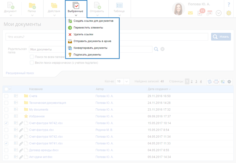 После выбора требуемых объектов к ним могут быть применены различные групповые операции с помощью кнопки Выбранные (рис. 2), расположенной в верхнем меню хранилища документов.