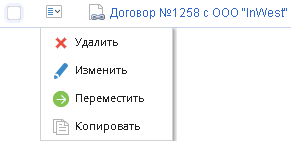 Кнопка контекстного меню располагается слева от столбца Название в таблице данных. Контекстное меню содержит операции, которые могут быть применены к документу, папке или ссылке на документ. Состав пунктов контекстного меню зависит от типа объекта и прав доступа пользователя.