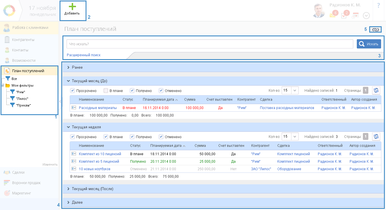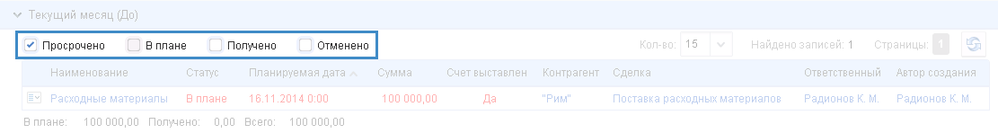 Данный раздел системы ELMA содержит информацию о плане поступления денежных средств – сумме денежных поступлений компании, их статусе, планируемой дате и т.д.