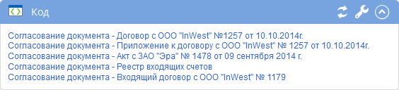 Каждая строка содержит информацию об одном согласовании. Первая часть строки (на скриншоте – "Согласование документа") содержит название задачи согласования, вторая часть строки – название документа. Сама строка представляет собой ссылку на страницу задачи согласования.