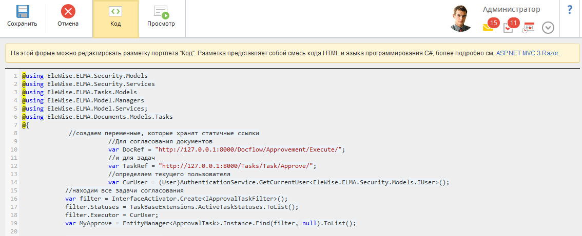 На данном портлете отображается результат работы программного кода на языке ASP.NET MVC 3 Razor. Программный код записывается в настройках портлета. Данный портлет удобен тем, что, разместив его на главной странице, пользователь всегда сможет видеть актуальные результаты работы кода.