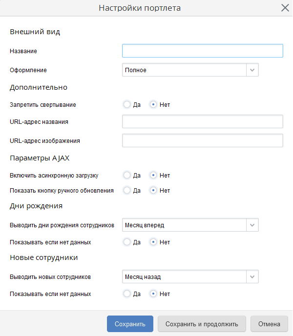 Показывать если нет данных – отображать или нет на портлете разделы Дни рождения и Новые сотрудники, если нет ни одного сотрудника для отображения.