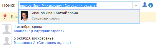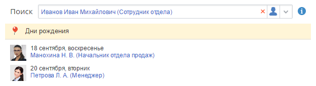 просмотр дней рождений сотрудников компании за период времени, указанный в настройках портлета.