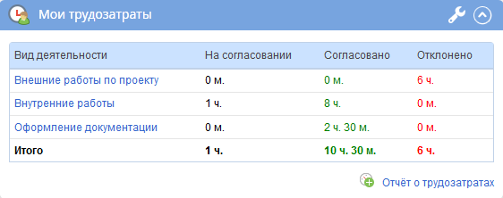 Режим отображения портлета – в выпадающем списке выберите период, за который будут отображаться данные по трудозатратам на портлете: текущая неделя, прошедшая неделя, текущий месяц или прошедший месяц.