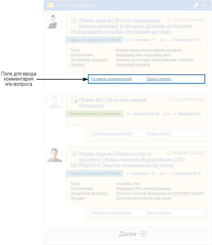 На портлете в специальном поле (рис. 1) можно оставить комментарий к сообщению или задать вопрос. Невозможно задать вопрос к сообщениям между пользователями.